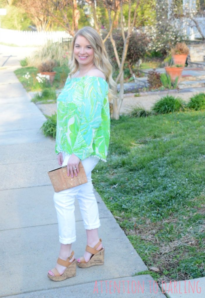 Here’s one way I styled it recently with my Lilly Pulitzer Enna Off Shoulder Top. I’m not only loving how this top is off the shoulder, but also how it has cute pom pom detail at the bottom. Unfortunately, this colorway is sold out (although, call your local signature store to double check), but I’ve tagged more favorites, plus other outfit details at the end of this post. I mentioned it in an earlier post, but I can’t get enough of these Target wedges that are only $33 and my J.Crew cork clutch is under $30.