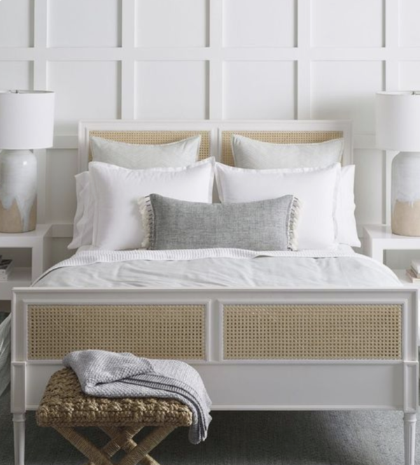 A rattan chair and our Arhaus bed bought from Craigslist.